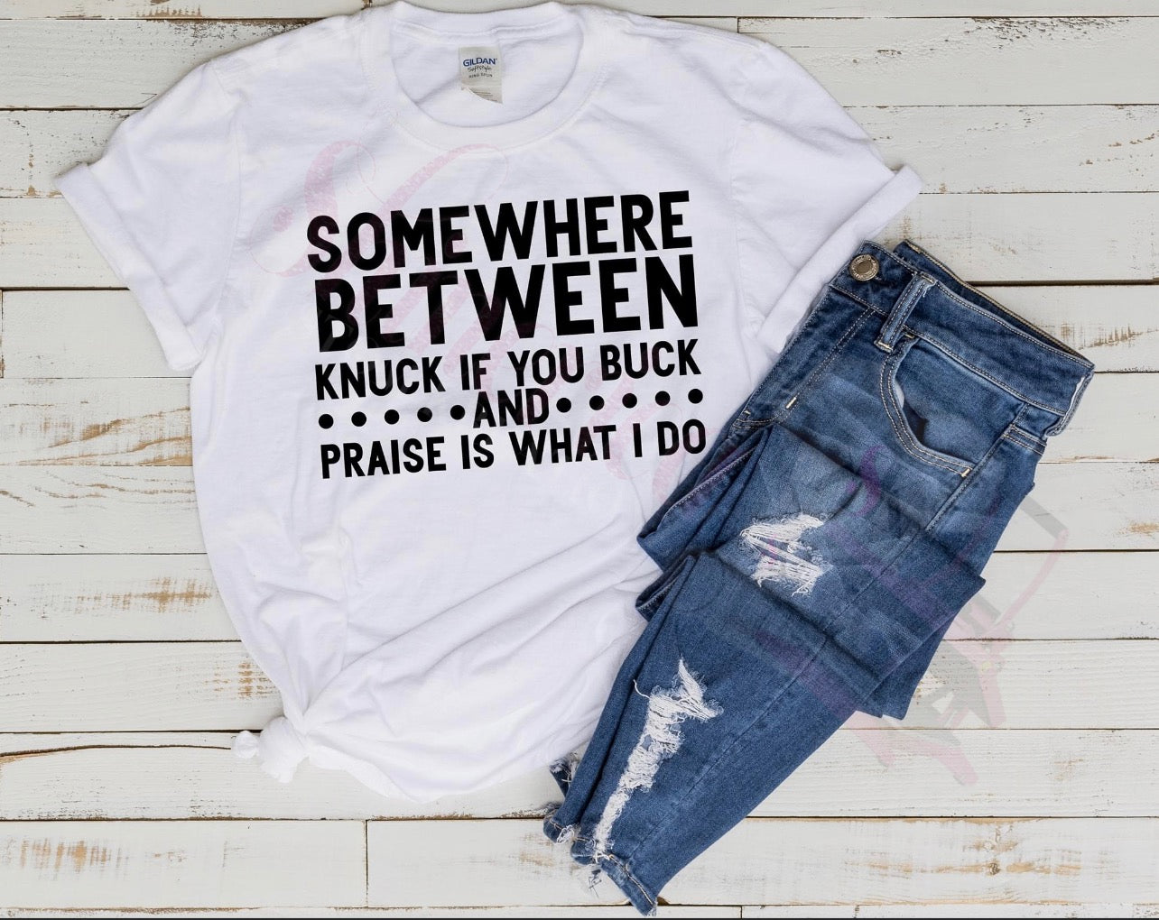 Mixture of both - the perfect blend of style and comfort! Somewhere between knuck if you buck and praise is what I do, this shirt is the perfect addition to any wardrobe. Wear it in confidence and show off your unique style!